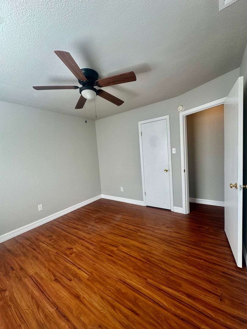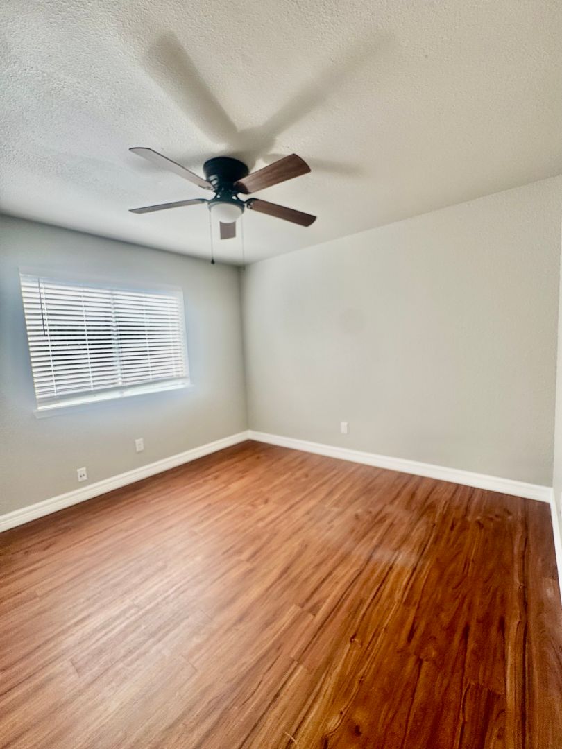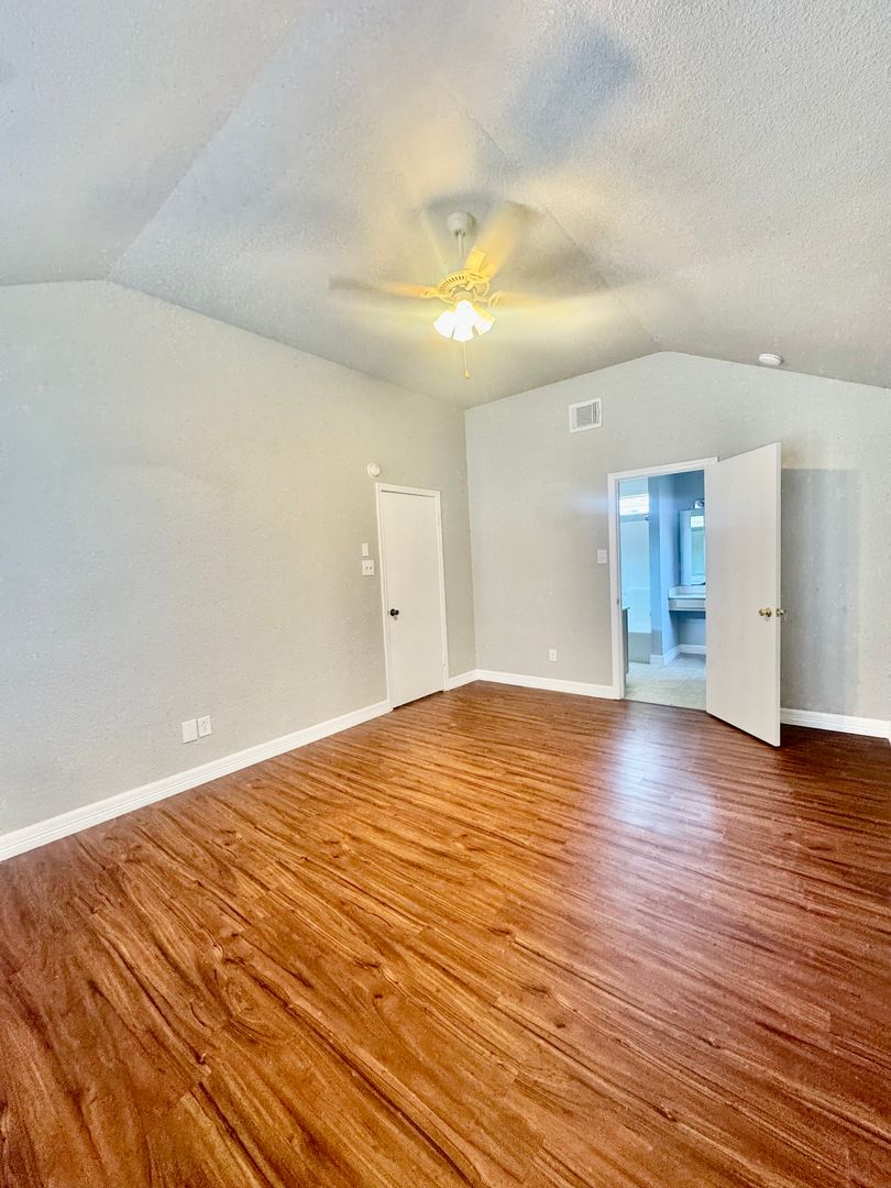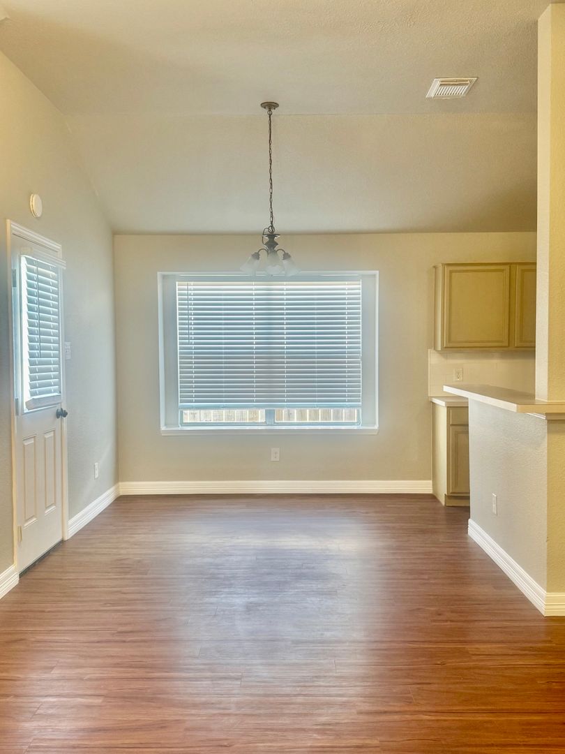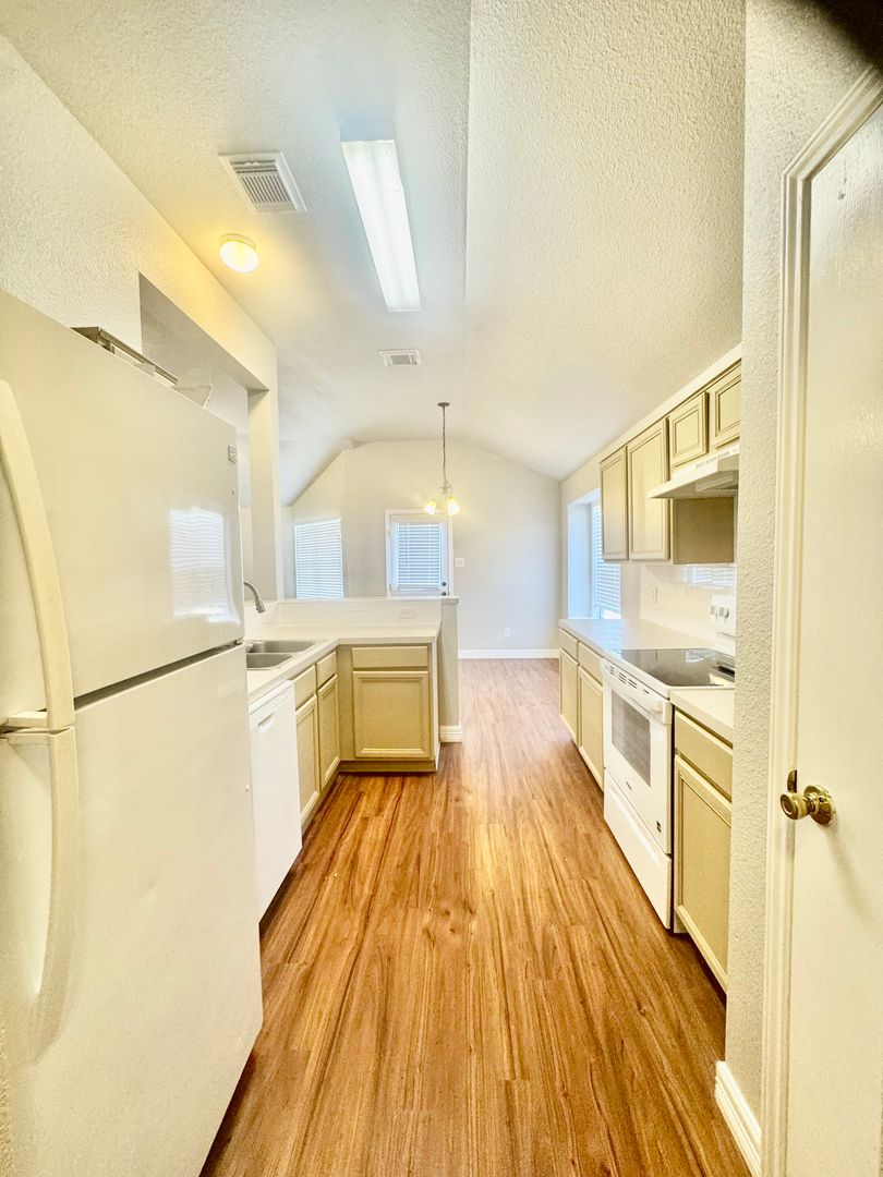 Inside, you’ll find faux wood plank flooring, ceiling fans in most bedrooms, and large walk-in closets for ample storage. The inviting fireplace with a decorative mantel adds a cozy touch, while the spacious kitchen provides plenty of counter space and includes a bar nook that opens to the dining area—perfect for entertaining or everyday living.