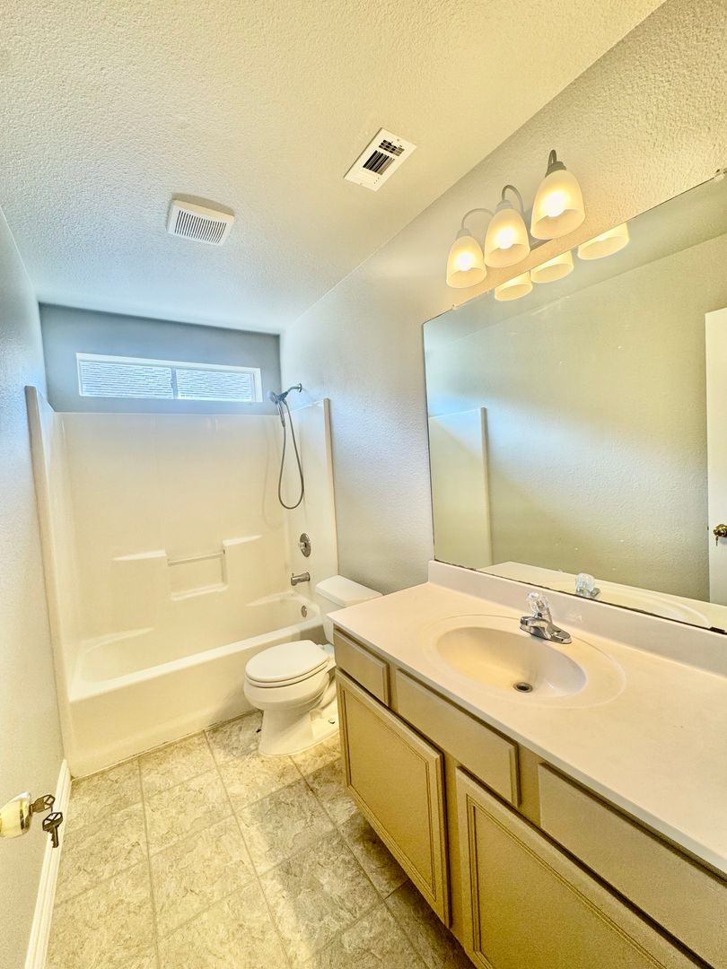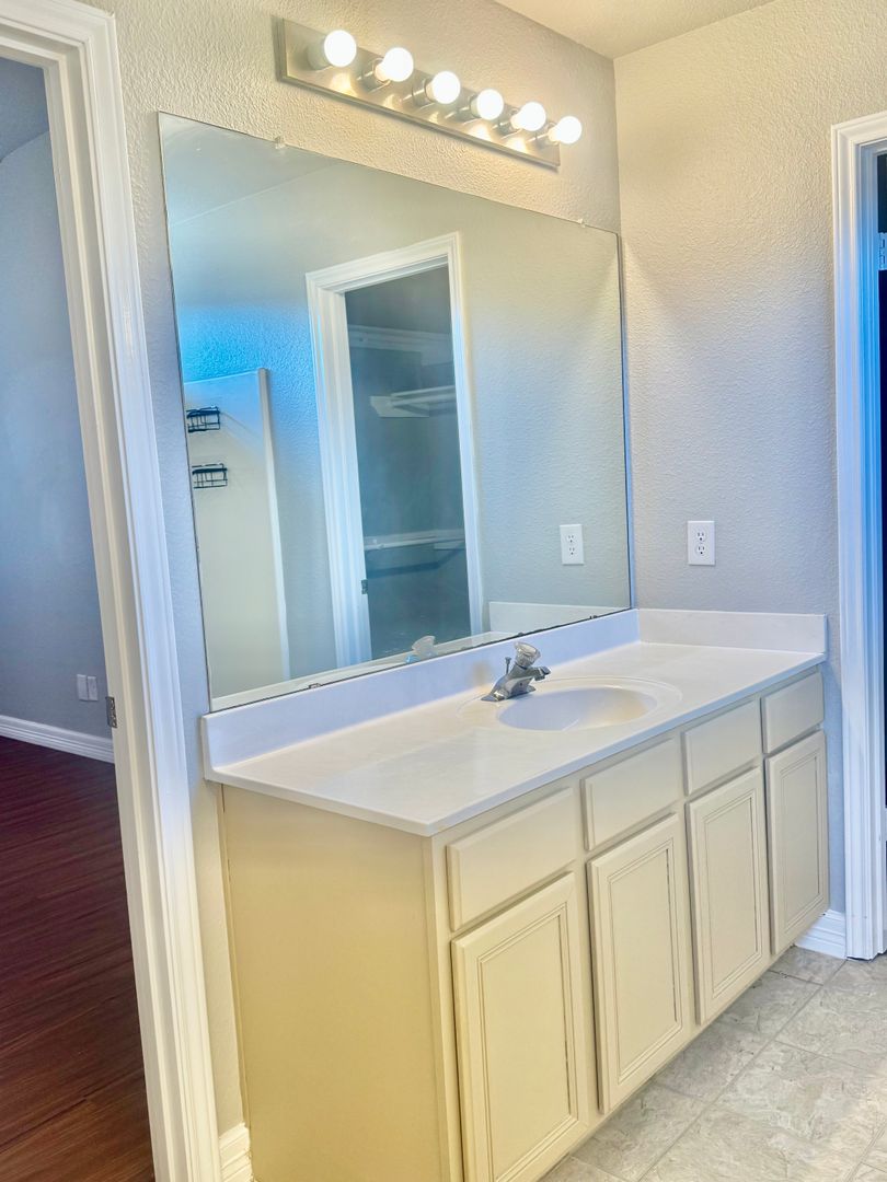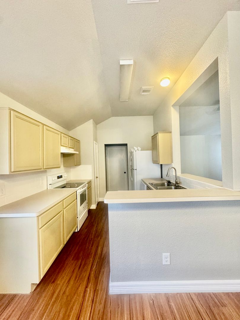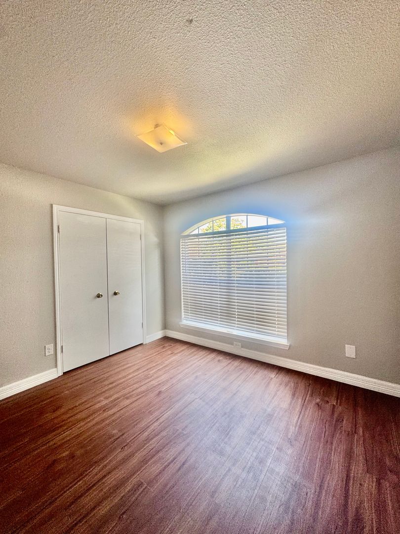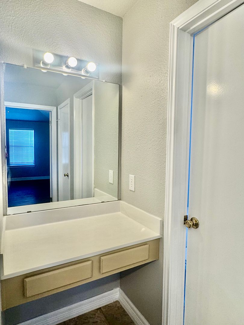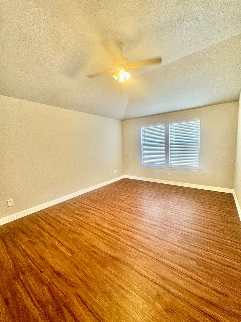 Inside, you’ll find faux wood plank flooring, ceiling fans in most bedrooms, and large walk-in closets for ample storage. The inviting fireplace with a decorative mantel adds a cozy touch, while the spacious kitchen provides plenty of counter space and includes a bar nook that opens to the dining area—perfect for entertaining or everyday living.