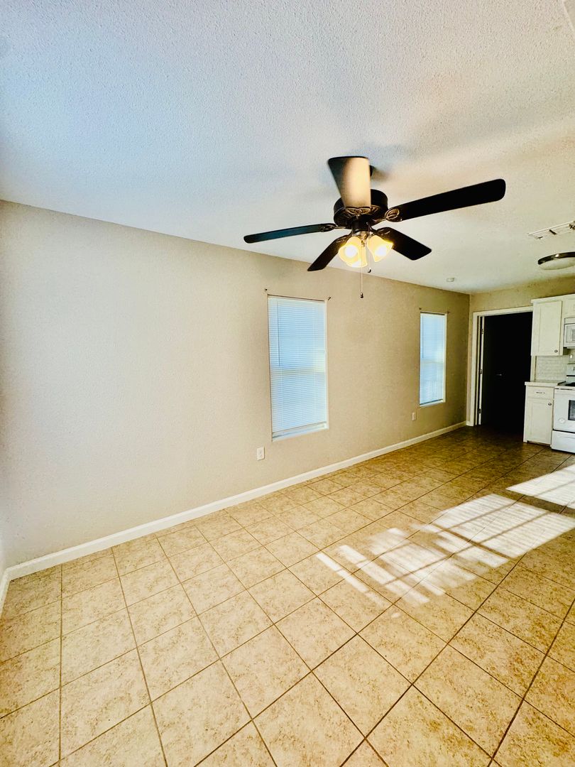 This well-maintained 2-bedroom, 1-bath home features tile flooring throughout and fresh paint. The kitchen is equipped with an electric stove, built-in microwave, and refrigerator.