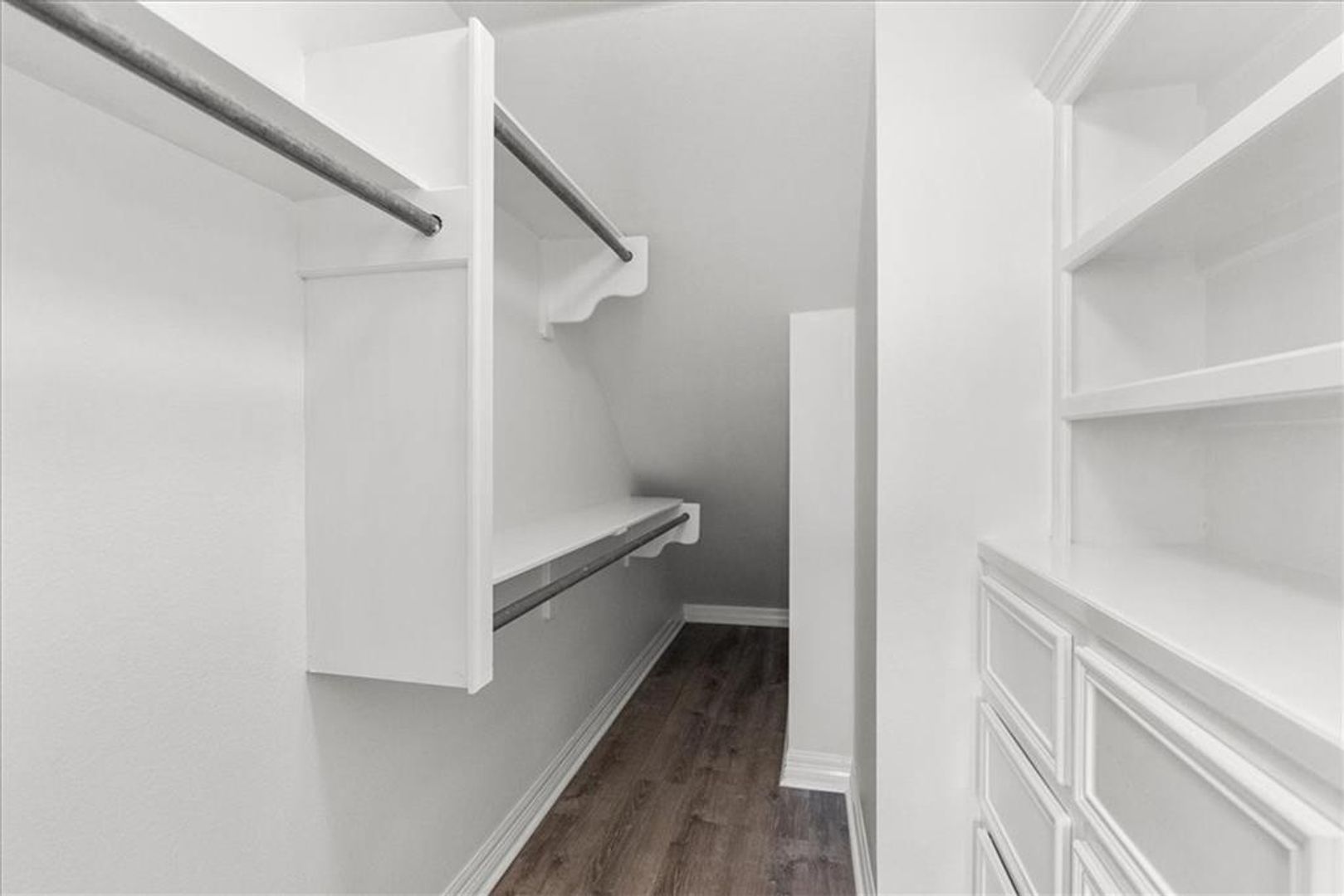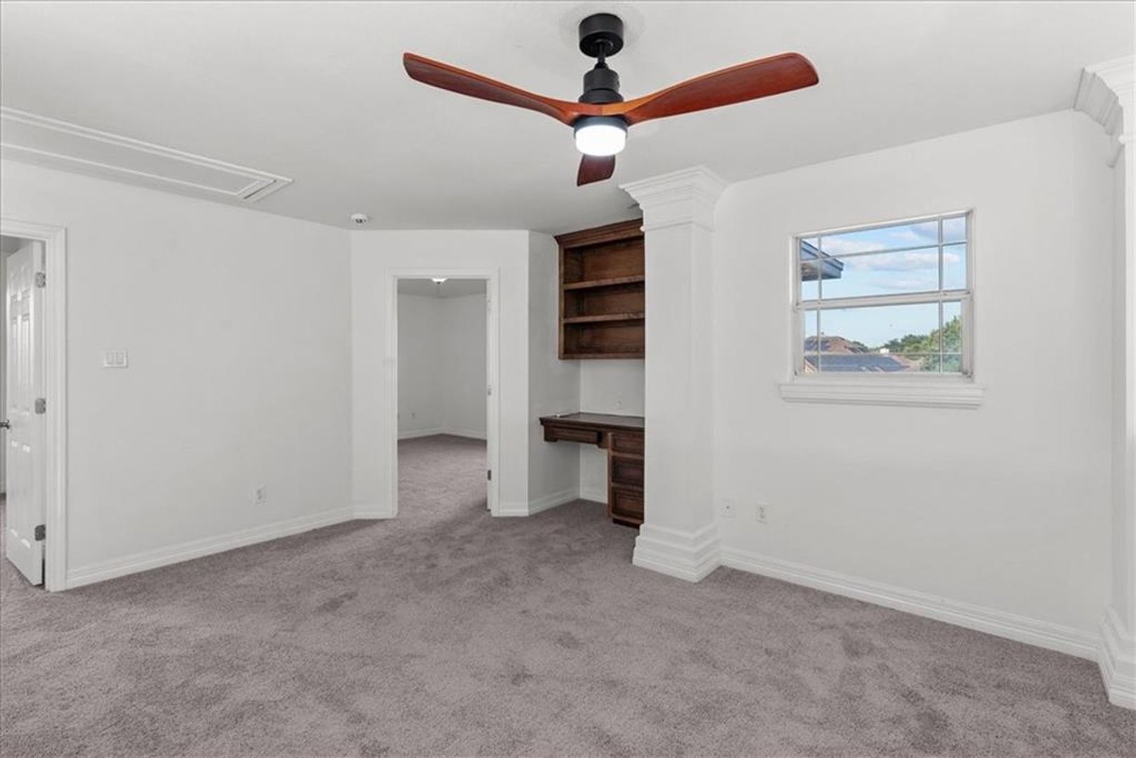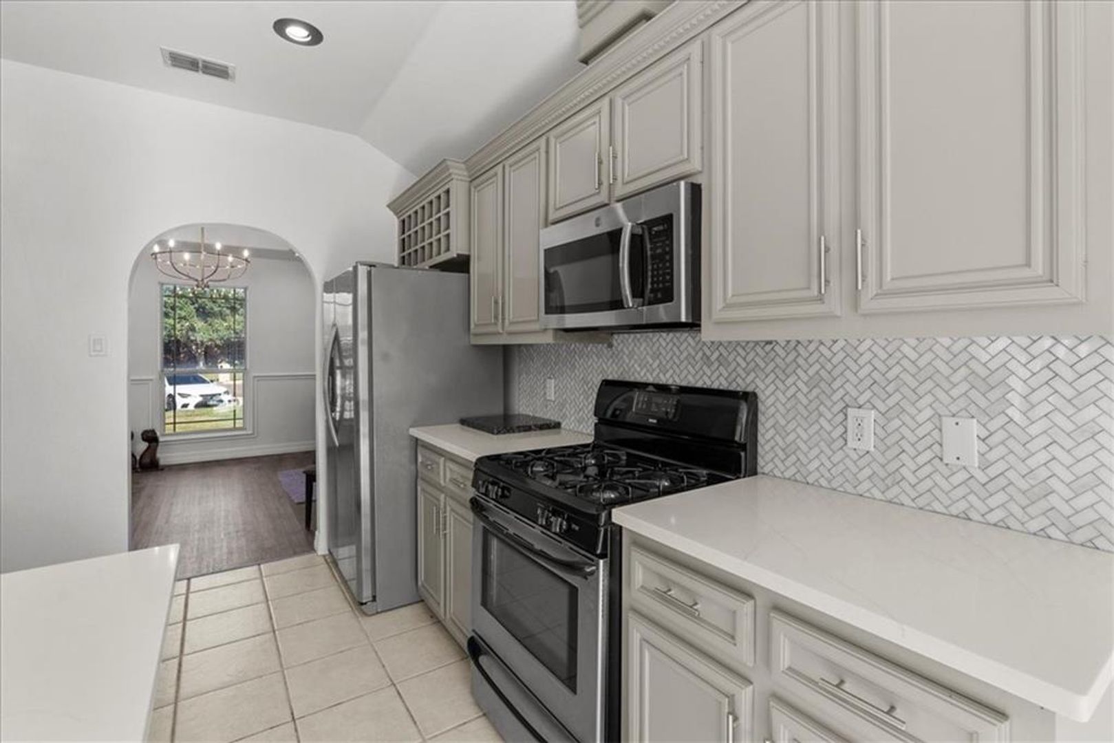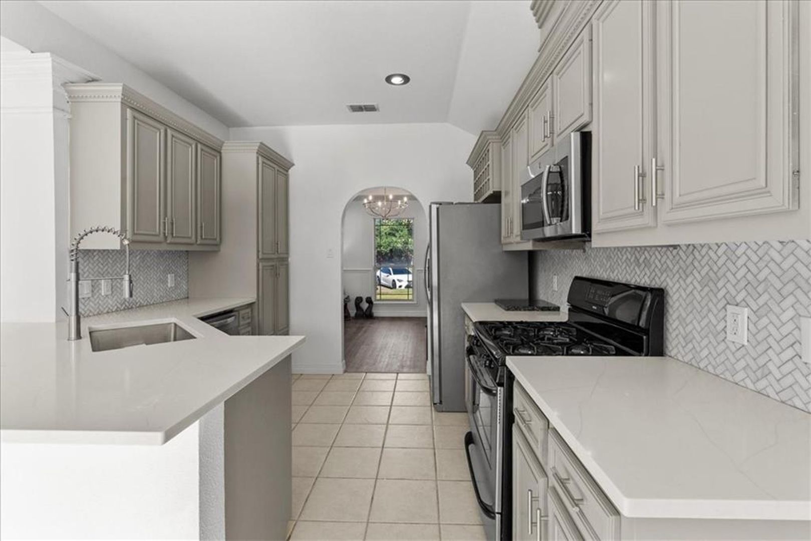 The kitchen shines with quartz countertops, stainless steel appliances, a gas stove, custom wood cabinetry, designer stone backsplash, and a breakfast bar. Upstairs, enjoy two versatile living spaces with a built-in desk—perfect for a home office.