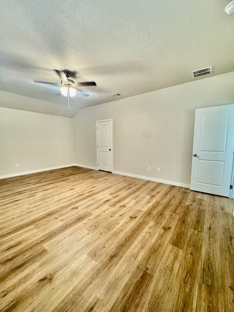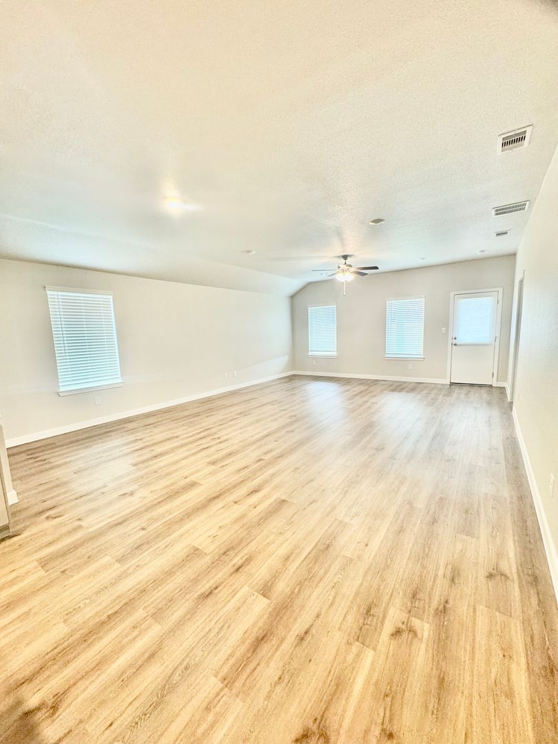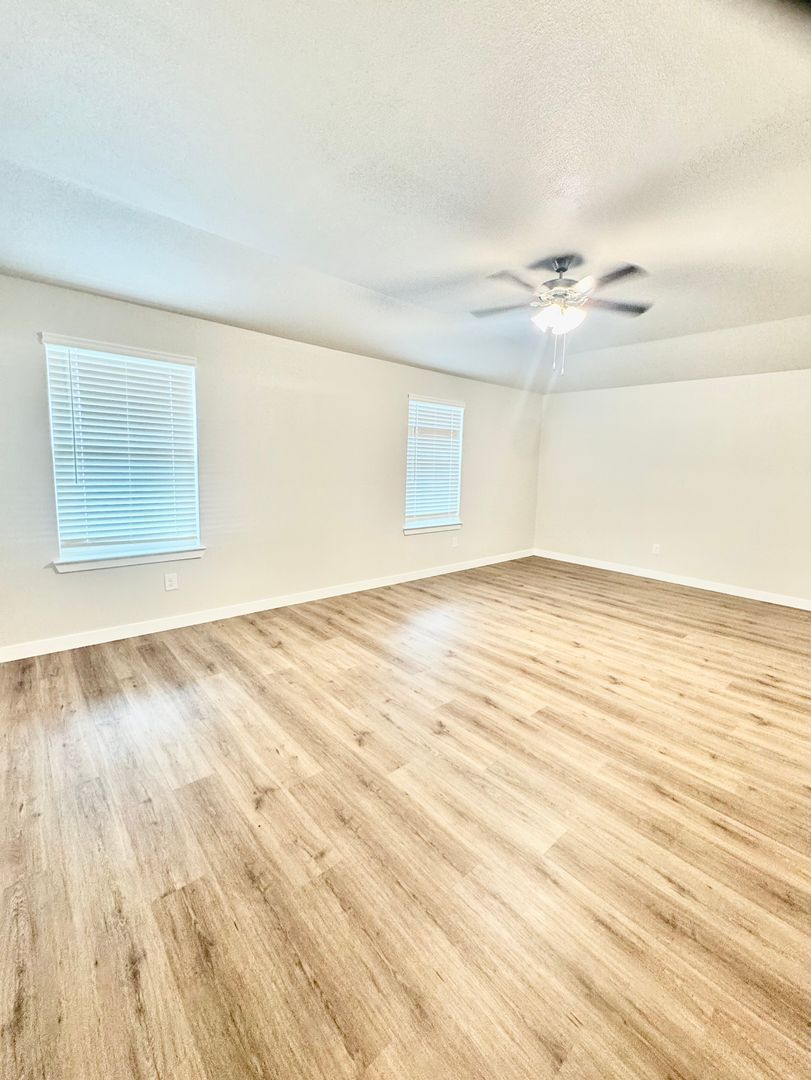 Enjoy ceiling fans and updated light fixtures throughout, with oak faux wood plank flooring in throughout home, no carpet.
