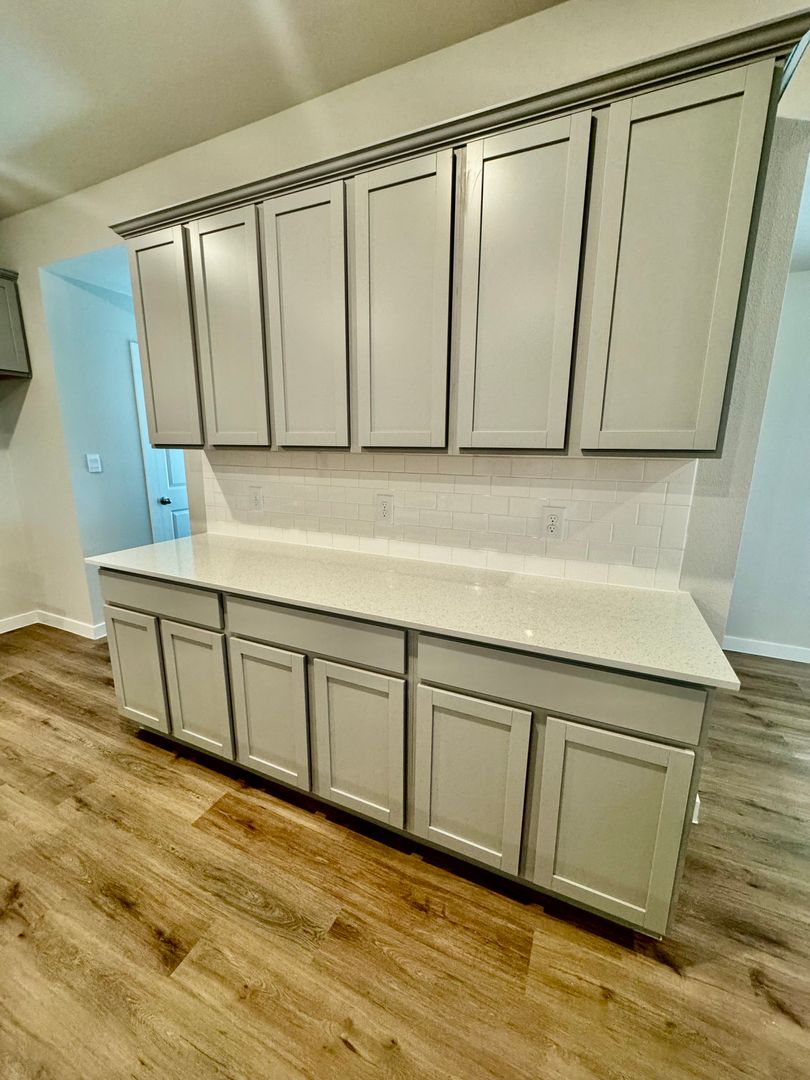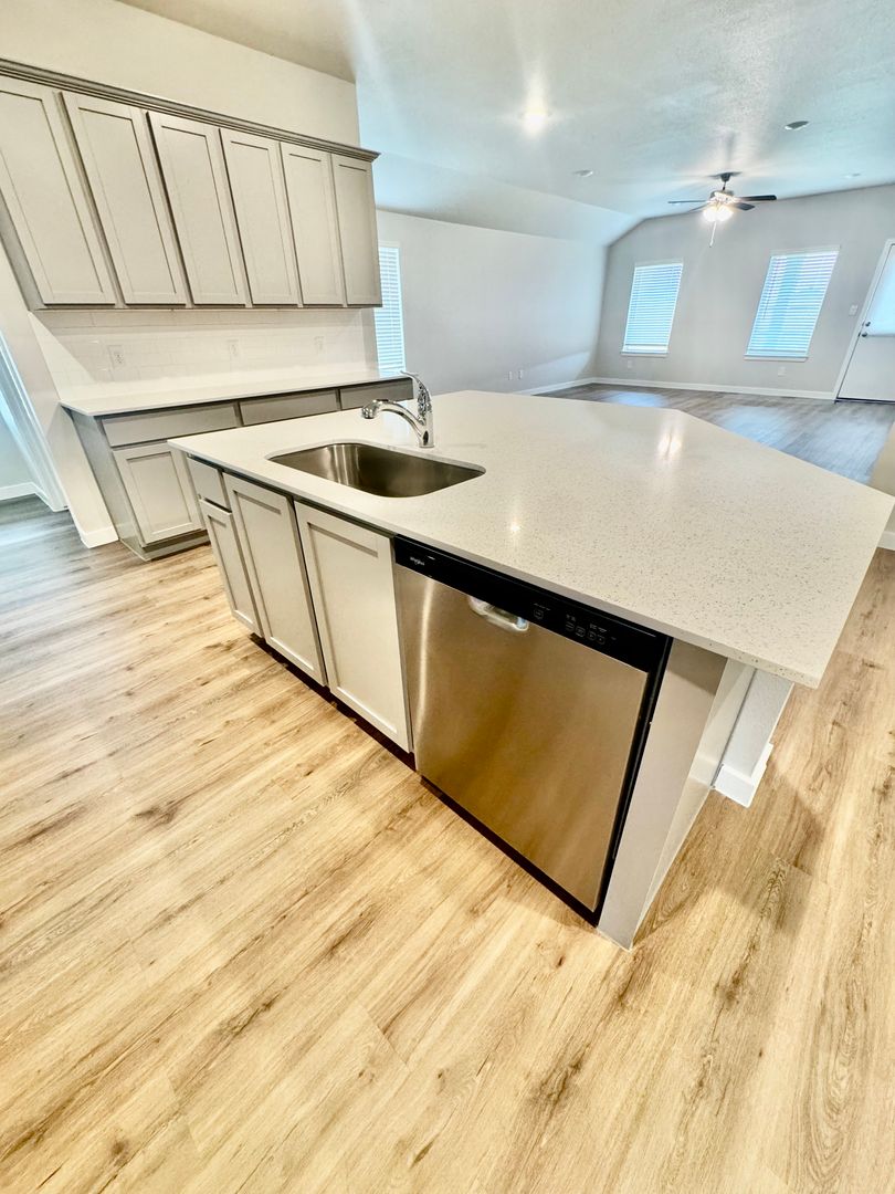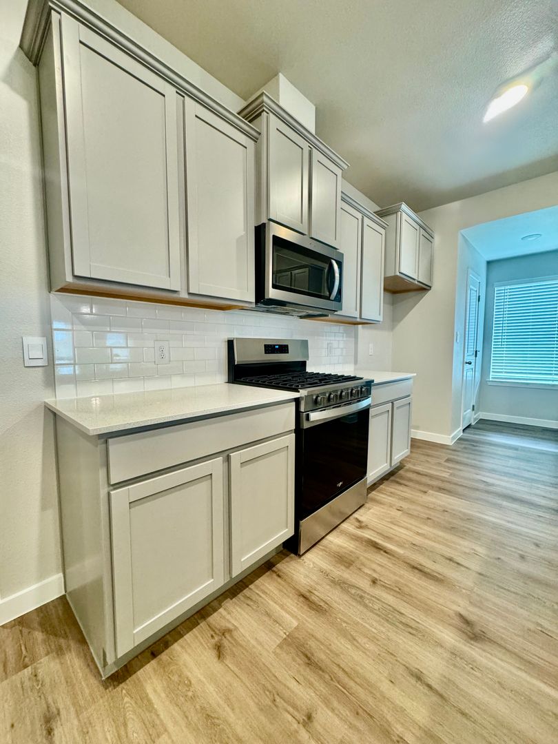 Step inside to an open floor plan filled with natural light. The kitchen includes brand-new stainless steel appliances—gas stove, dishwasher, and built-in microwave—paired with gray cabinets and a white backsplash for a sleek, contemporary look.